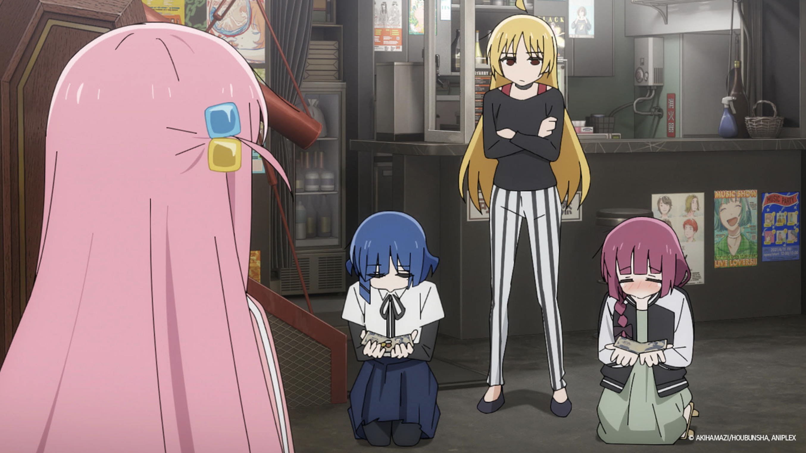 후배 고토 히토리에게 삥 뜯다시피 돈을 빌리고 늦게 갚아 반성하고 있는 야마다 료와 히로이 키쿠리 봇치 더 록! 후편 에피소드 2 라이브하우스 FOLT에서 새로운 등장 인물 인디 밴드 Sick Hack의 멤버들 -!